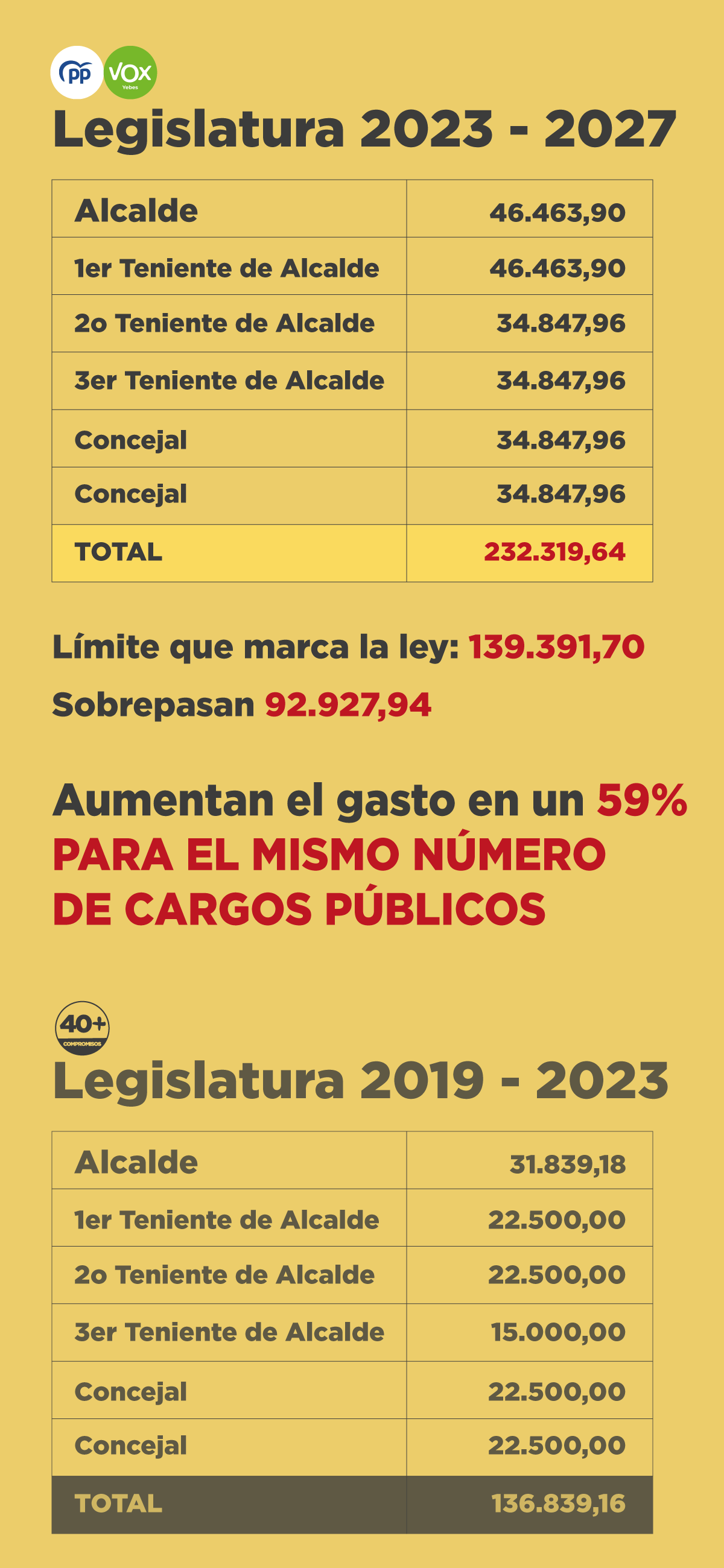 La segunda muestra la restribuciones salariales que eligió el grupo de gobierno que llevó las riendas del municipio desde el 2019 al 2023.