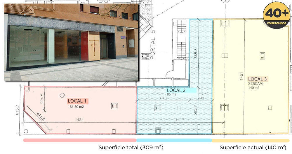 Plano que auna las superficies totales: la actual (amarillo) con las adyacentes (azul y rojo). Se obtendría más del doble del espacio actual.